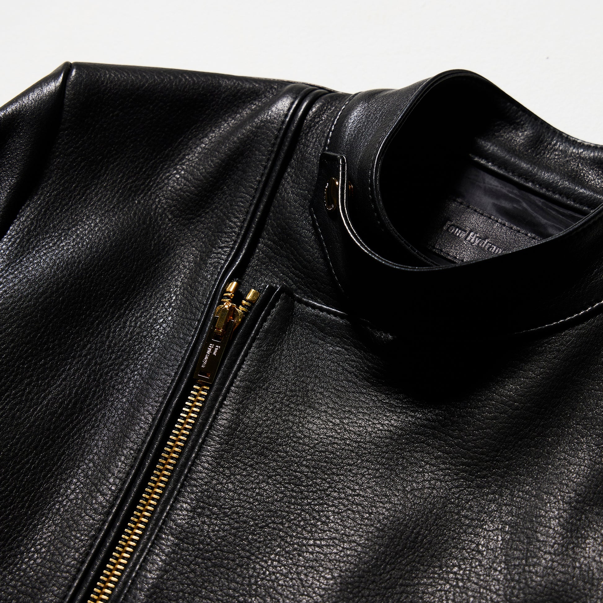 「Four Hydrangea 」のアイコン、ブランドロゴ入りのオリジナルゴールドメタルパーツとイタリアのLAMPO社のファスナーが、このジャケットをさらに唯一無二に引き立てて至極の一着が誕生した。