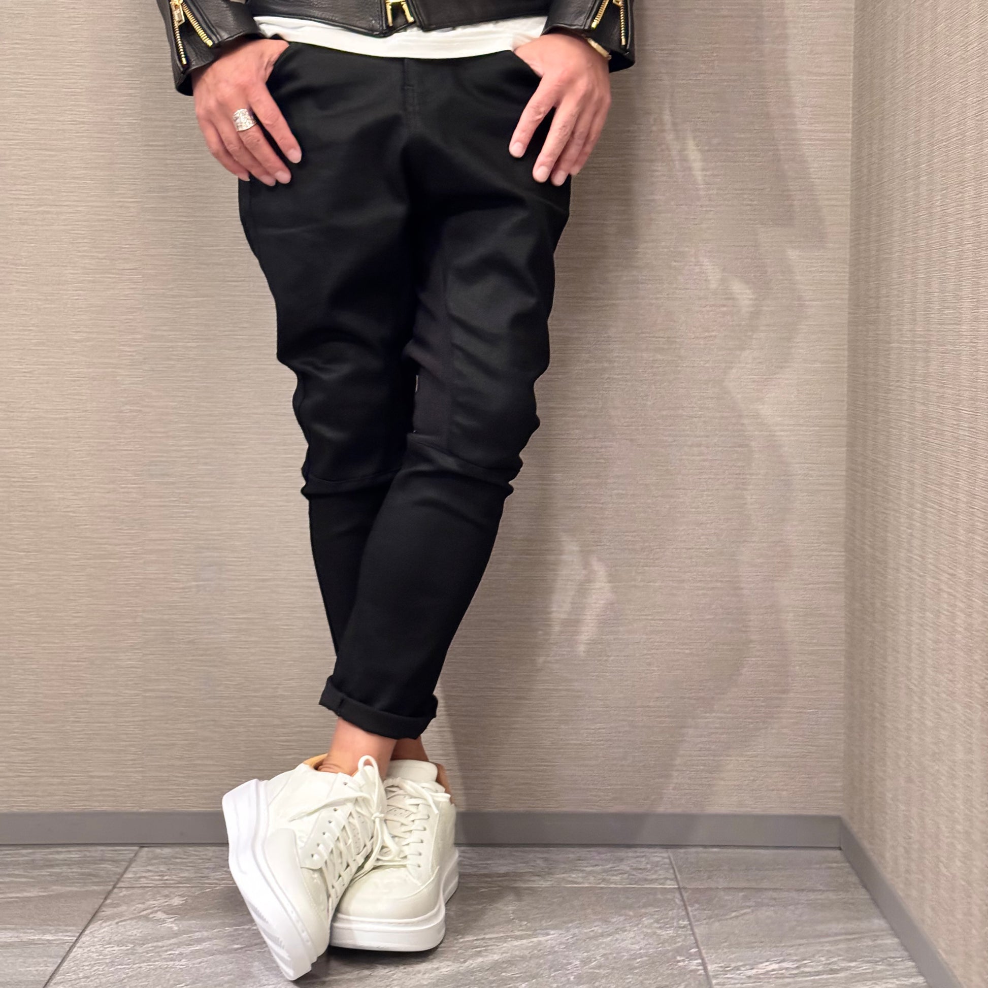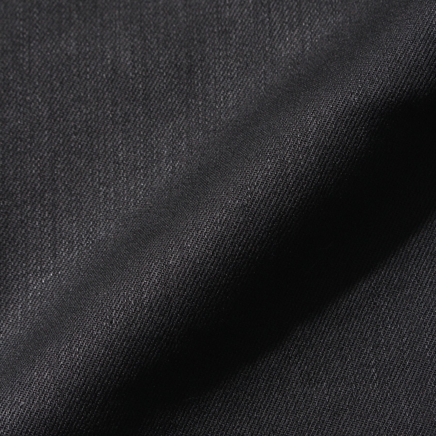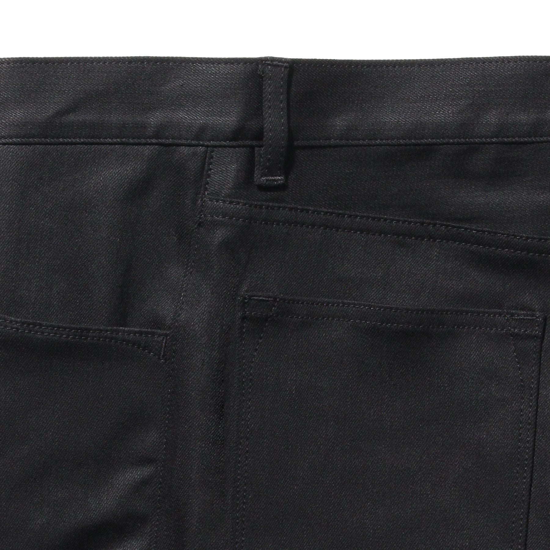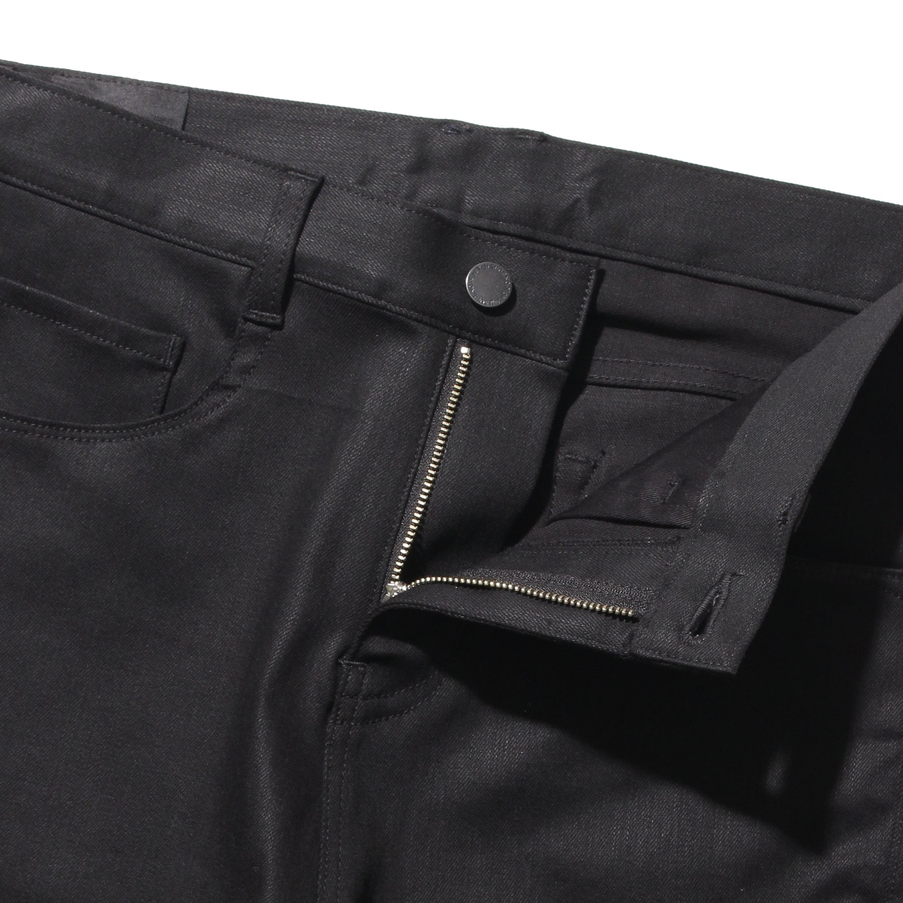 黒のポリエステルとポリウレタンを混紡した糸にスラブ糸で編みたててよりツヤ感のあるキックバックの強いハイブリッドなストレッチデニムに昇華。