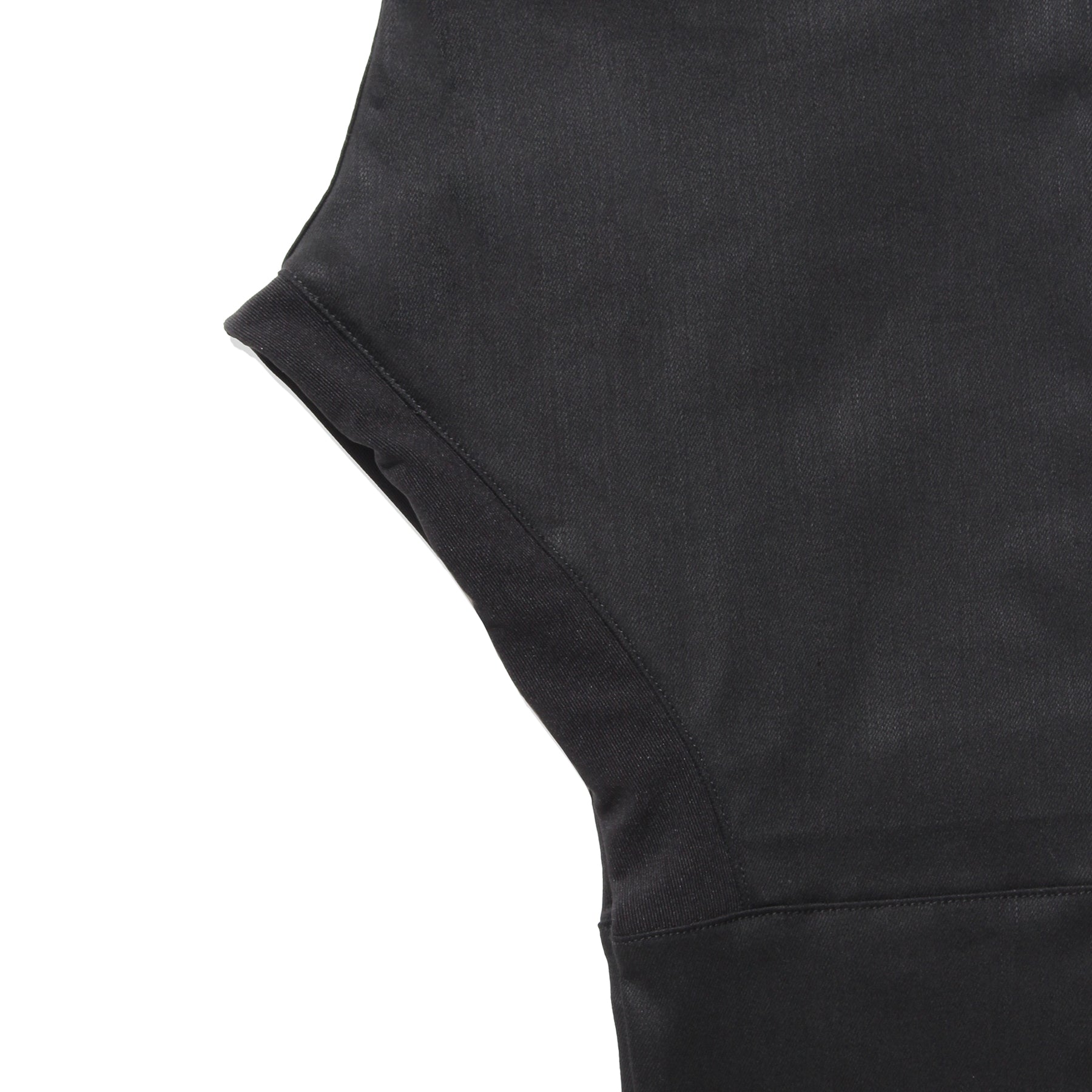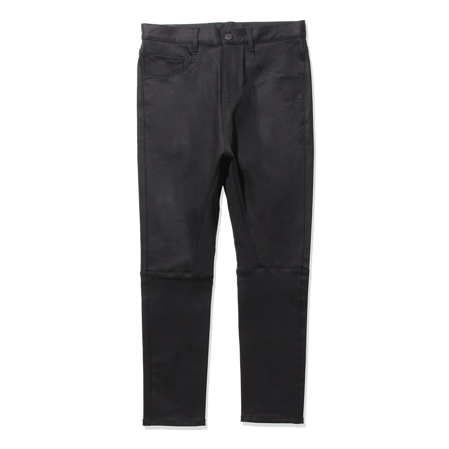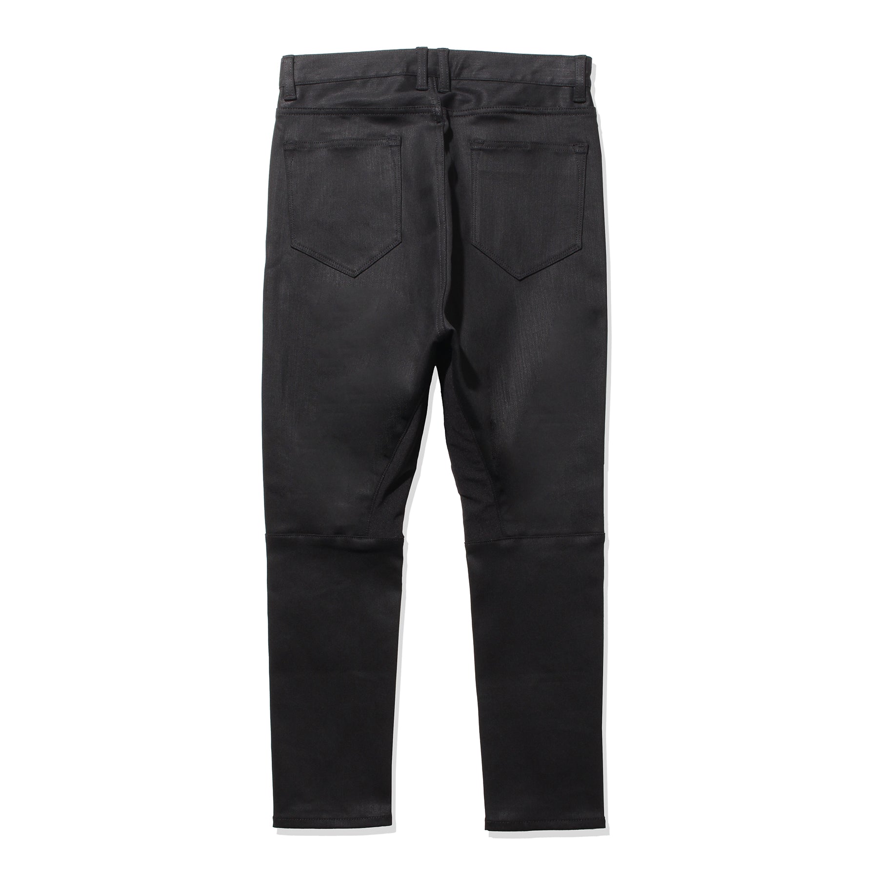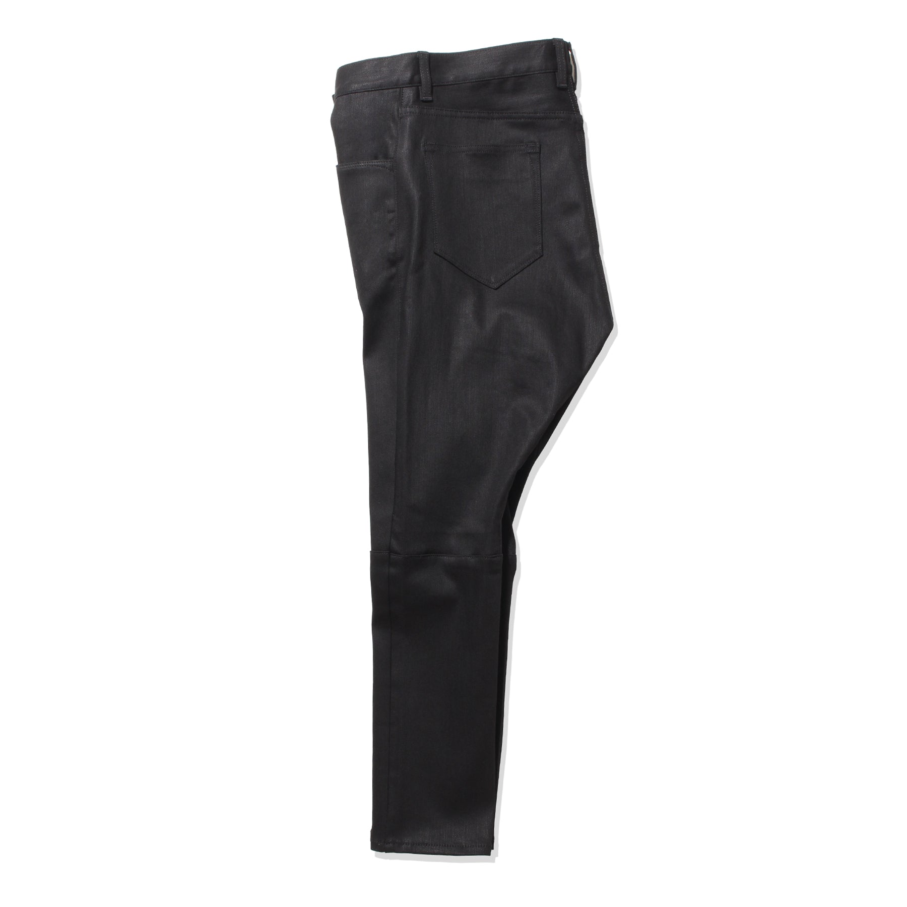 黒のポリエステルとポリウレタンを混紡した糸にスラブ糸で編みたててよりツヤ感のあるキックバックの強いハイブリッドなストレッチデニムに昇華。