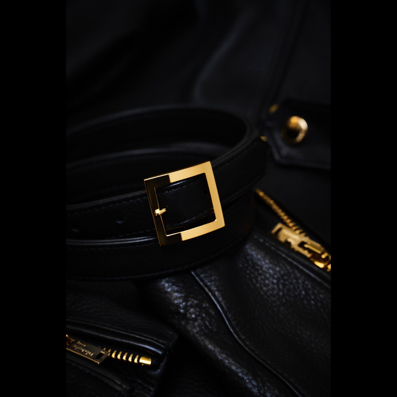 金具はライダースと同じスクエアシェイプのオリジナルゴールドメタルパーツ。