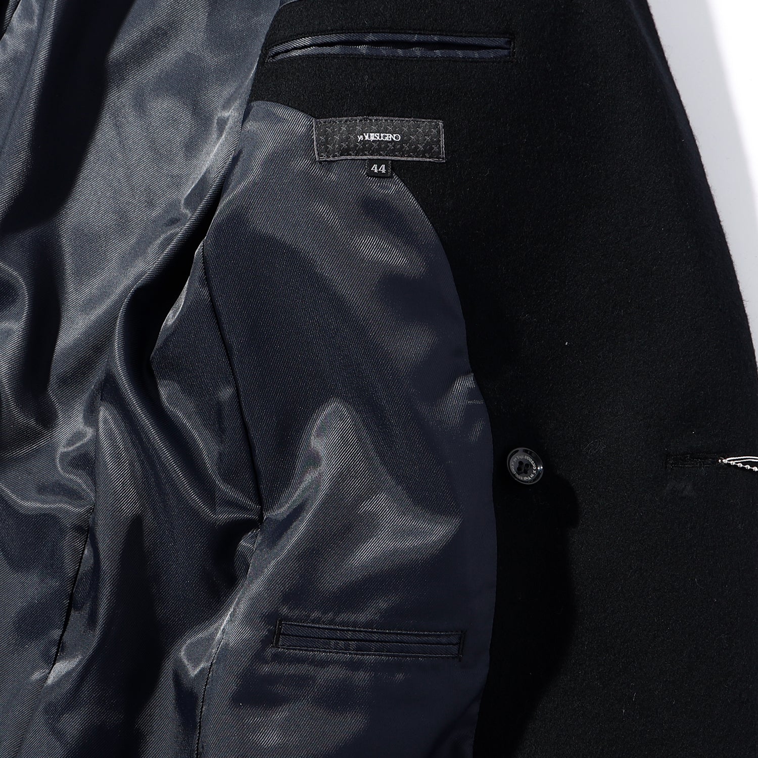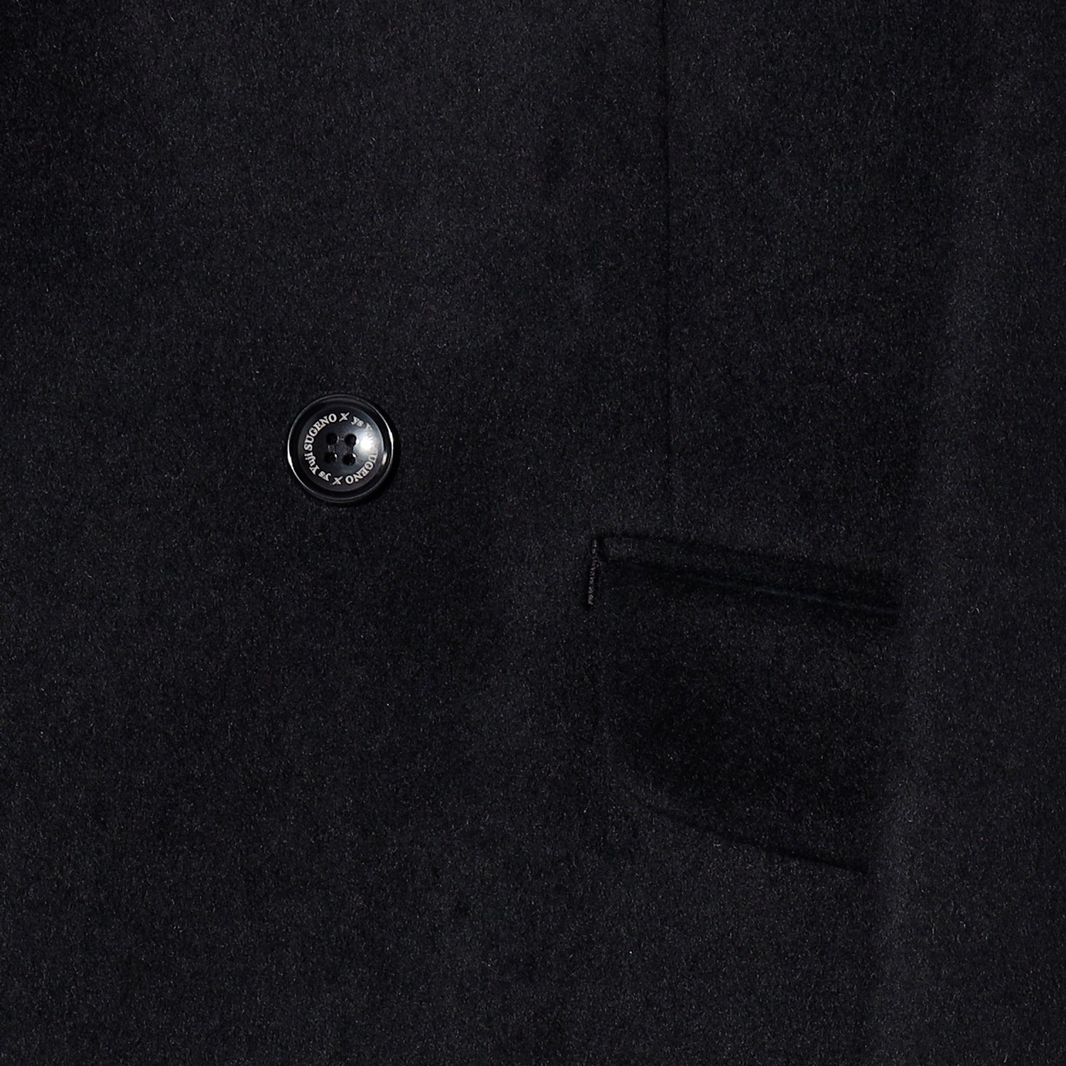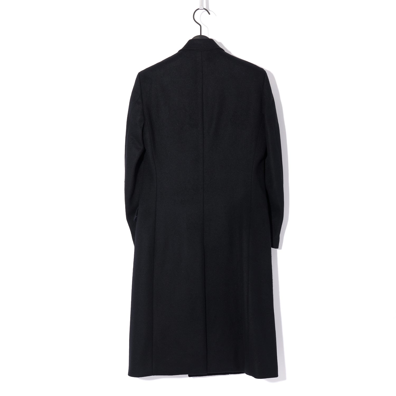 内側はお台場仕立てでシガーポケットを配置、袖は本切羽仕様の5つボタン、肩パッド入りのショルダーに襟ヒゲ・カラークロス仕様などクラシカルなテクニックで構築された最高級コート。
