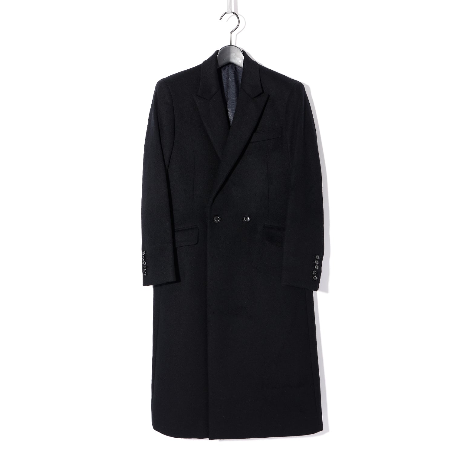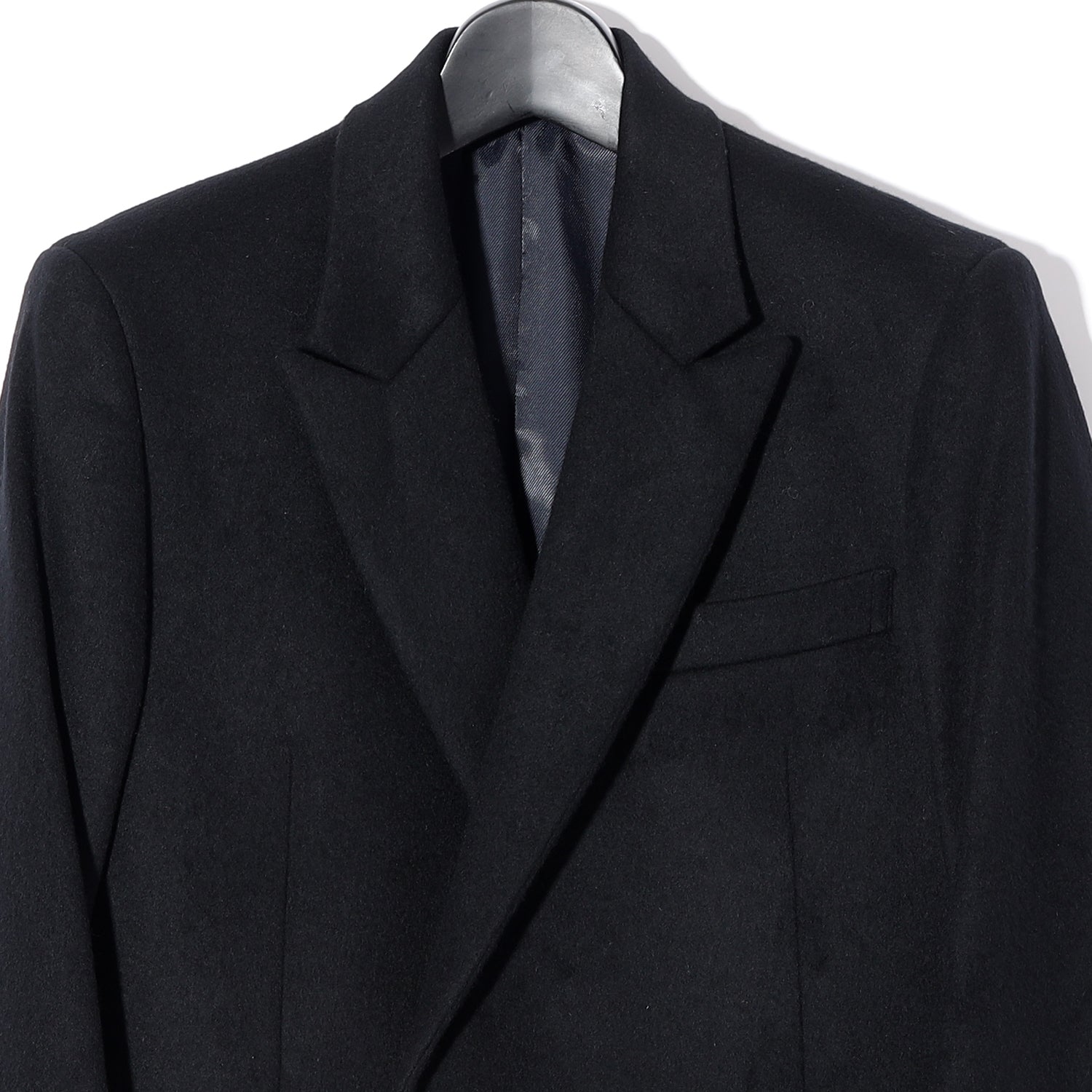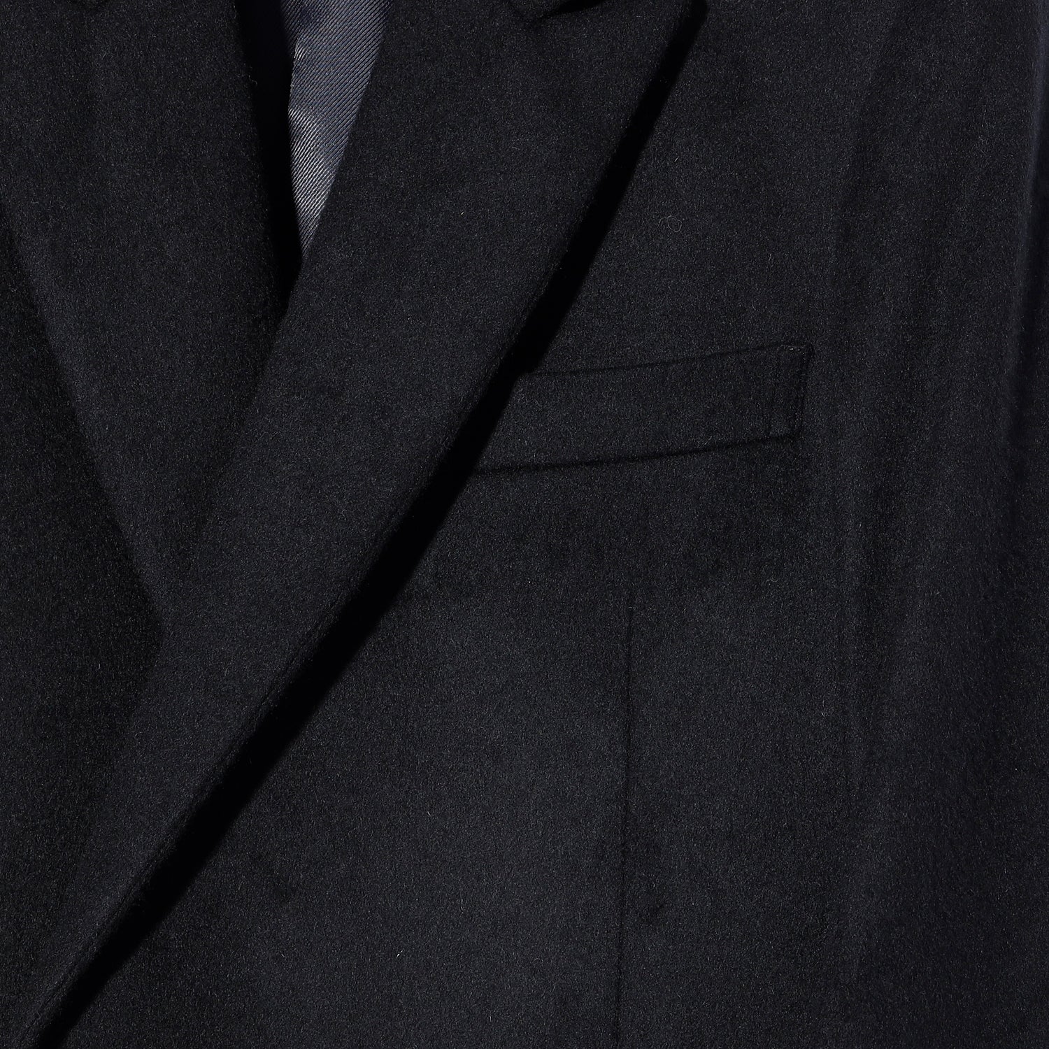内側はお台場仕立てでシガーポケットを配置、袖は本切羽仕様の5つボタン、肩パッド入りのショルダーに襟ヒゲ・カラークロス仕様などクラシカルなテクニックで構築された最高級コート。
